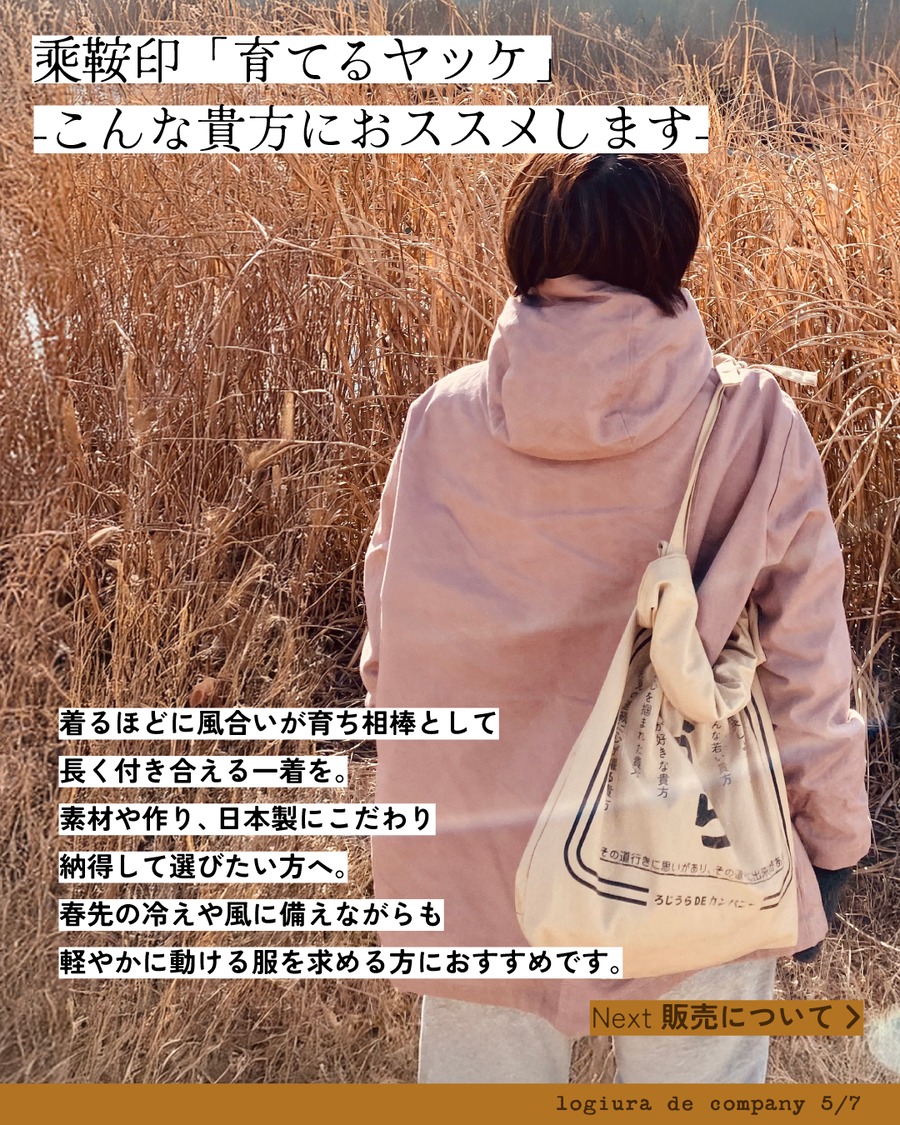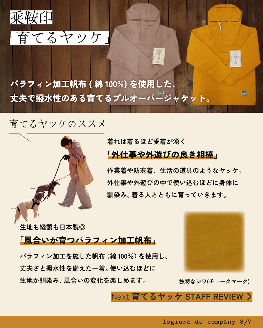乗鞍印「育てるヤッケ」は、丈夫で撥水性のある帆布 (綿100%) を使用したプルオーバージャケットです。作業着や防寒着など幅広く使える生活の道具のような服をイメージされています。パラフィン加工が施されているので雨や水からしっかりと身を守り、さまざまなシーンで活躍すること間違いなし!
