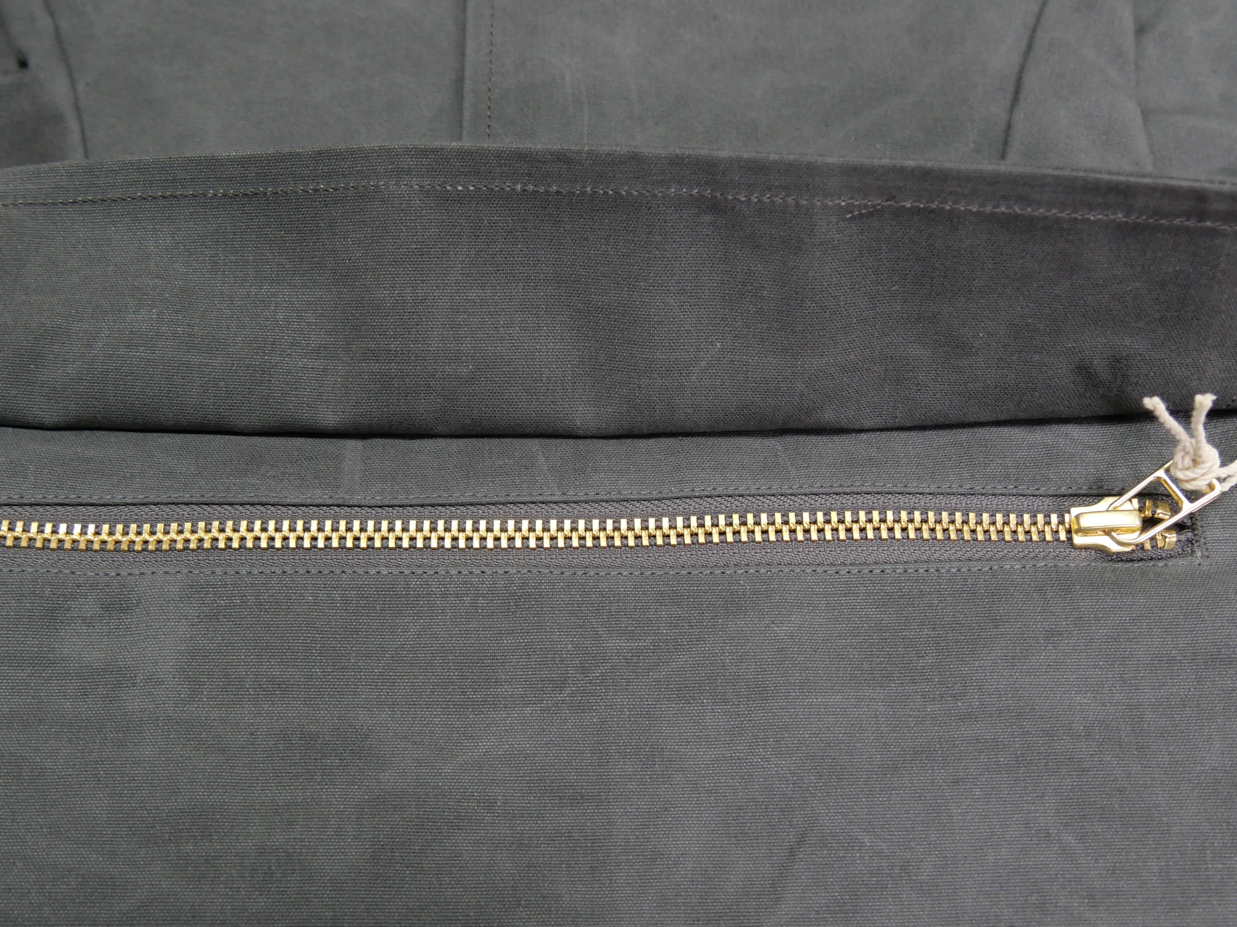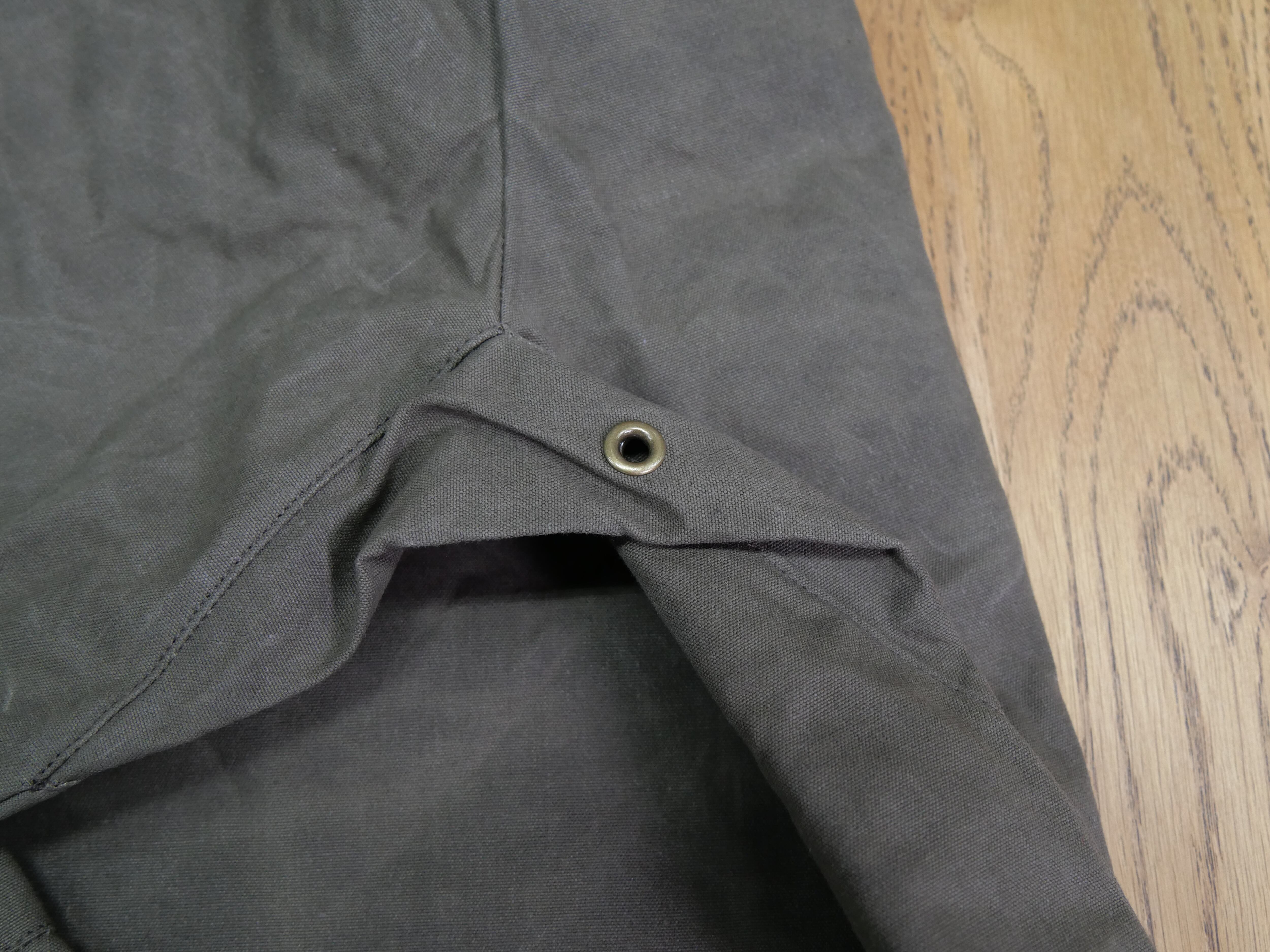 ・洗う事により蝋が落ち撥水性やハリ感が失われますが、蝋引きをおこなうことで復元できます。→市販のキャンバス用固形ワックスや蜜蝋・パラフィンワックスなどを塗りこんでドライヤーや低温アイロンなどでワックスを生地に浸透させ、ワックスが透明になったら固まるまで数分間放置します。