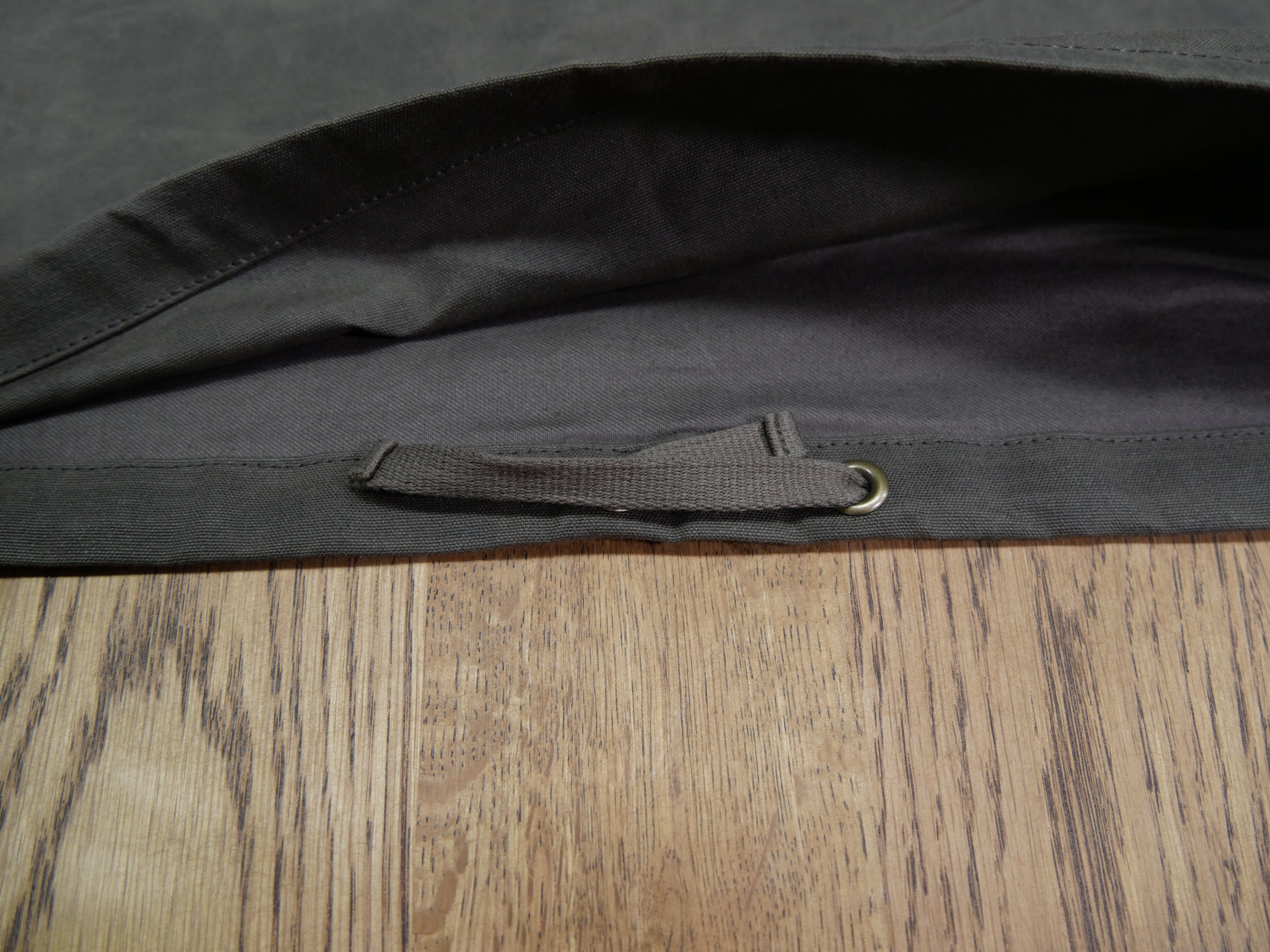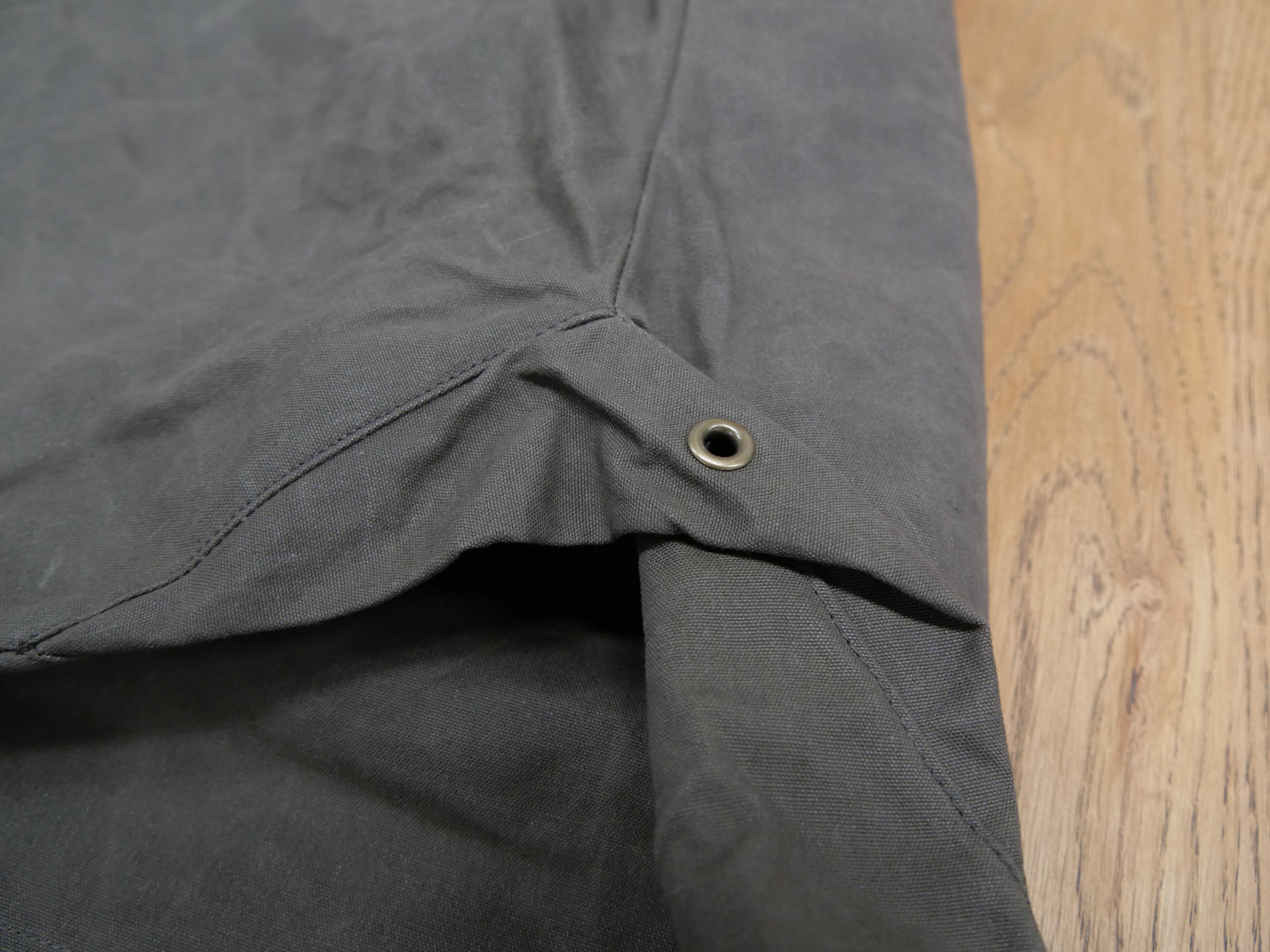 ・洗う事により蝋が落ち撥水性やハリ感が失われますが、蝋引きをおこなうことで復元できます。→市販のキャンバス用固形ワックスや蜜蝋・パラフィンワックスなどを塗りこんでドライヤーや低温アイロンなどでワックスを生地に浸透させ、ワックスが透明になったら固まるまで数分間放置します。